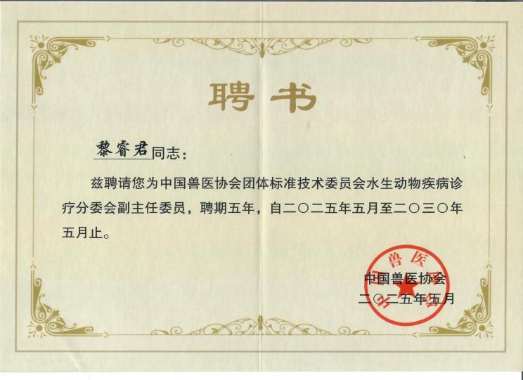 为推进我国水生动物疾病诊疗行业标准化建设,规范行业发展。2025年10月31日在广州召开中国兽医协会团体标准技术委员会水生动物疾病诊疗分委会成立大会及分委会第一次工作会。我院教师黎睿君教授当选为中国兽医协会团体标准技术委员会水生动物疾病诊疗分委会副主任委员。黎睿君教授长期从事水生动物医学的教学科研工作,此次当选为水生动物疾病诊疗分委会副主任委员,展现了我校水产学科建设和人才培养成效。