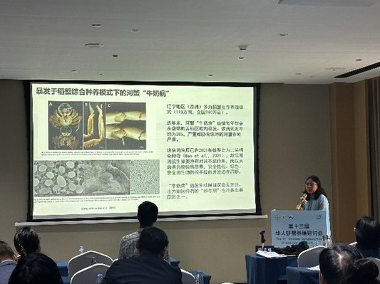我院虾蟹增养殖创新团队李冰玉、黄姝两位教师受邀参会,并分别于健康养殖、加工与质量安全分会场和免疫与病害分会场,以《中华绒螯蟹“牛奶病”的防控策略探索》《中华绒螯蟹蜕壳过程中免疫应答的动态调控机制》为题作了学术报告。报告中,李冰玉老师系统阐述了“牛奶病”的发病特征、流行规律,初步分析了病害成因,并结合实验室多年研究实践,提出了综合防控技术方案。黄姝老师就中华绒螯蟹不同蜕壳阶段免疫相关基因的表达规律、免疫细胞活性变化及调控通路进行了阐明,探讨了蜕壳期免疫应答的动态平衡机制,为免疫增强剂研发,养殖管理策略的优化提供了理论支撑。两个报告引发了与会代表的广泛关注与交流讨论。